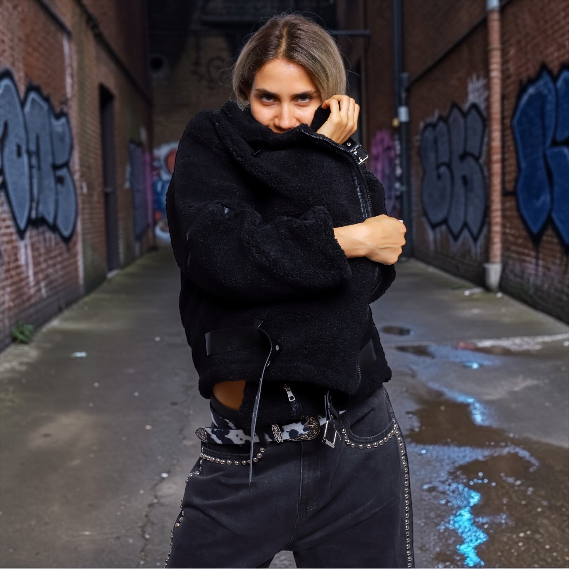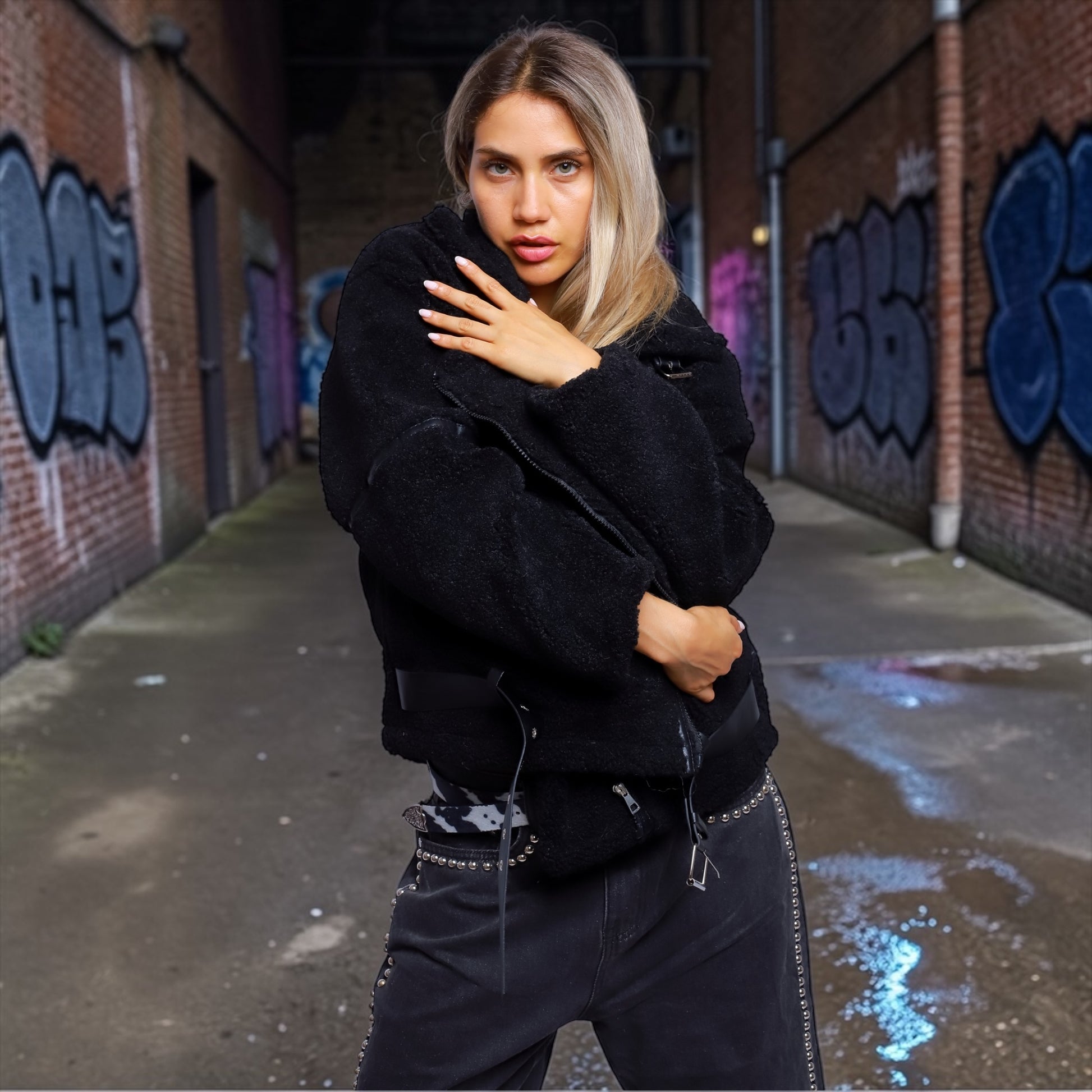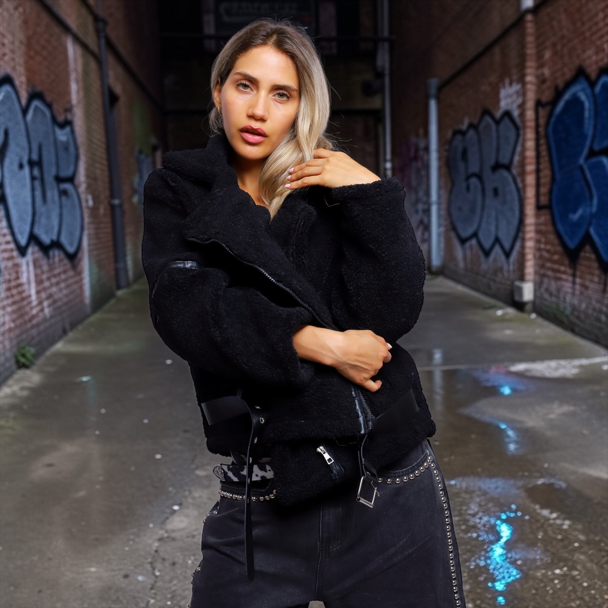 Abrigo de corderito vegano de textura suave y volumen envolvente, diseñado para aportar abrigo y actitud a cualquier look urbano.