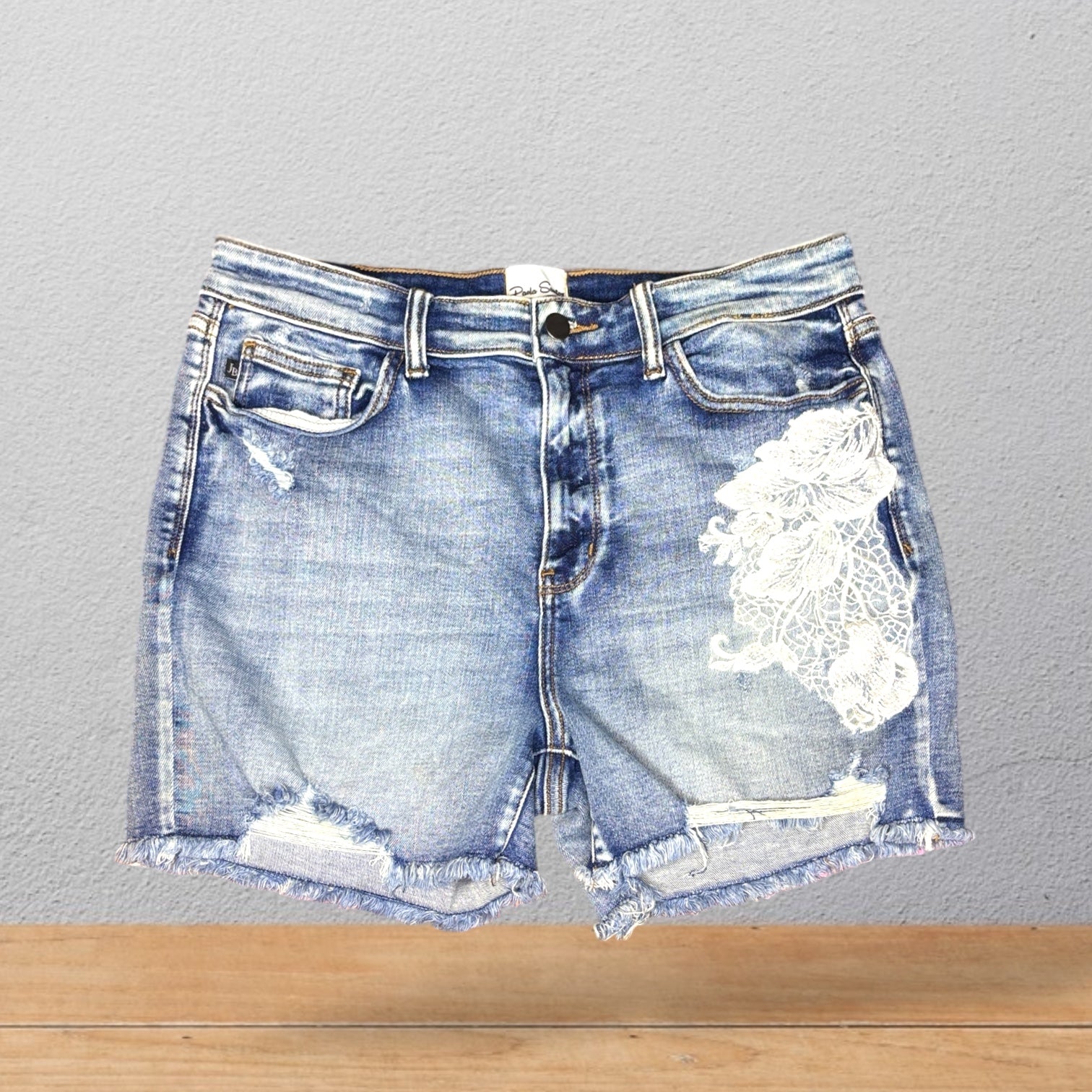 Esta bermuda de jean combina el espíritu urbano del denim con el encanto artesanal del encaje aplicado a mano, logrando una pieza única que no pasa desapercibida.