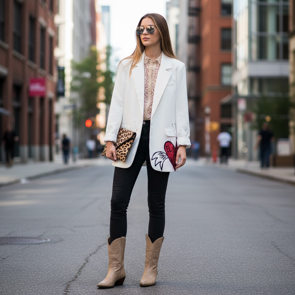 Blazer largo de corte recto con solapa clásica y cierre con botón frontal. Una prenda que redefine el poder del blanco: limpio, fuerte y cargado de mensaje. En la espalda, la frase “¿Estás teniendo la vida que querés o la que quieren los demás?” invita a mirar hacia adentro, mientras que el corazón rojo del frente recuerda que el amor es libre, empezando por el amor propio.