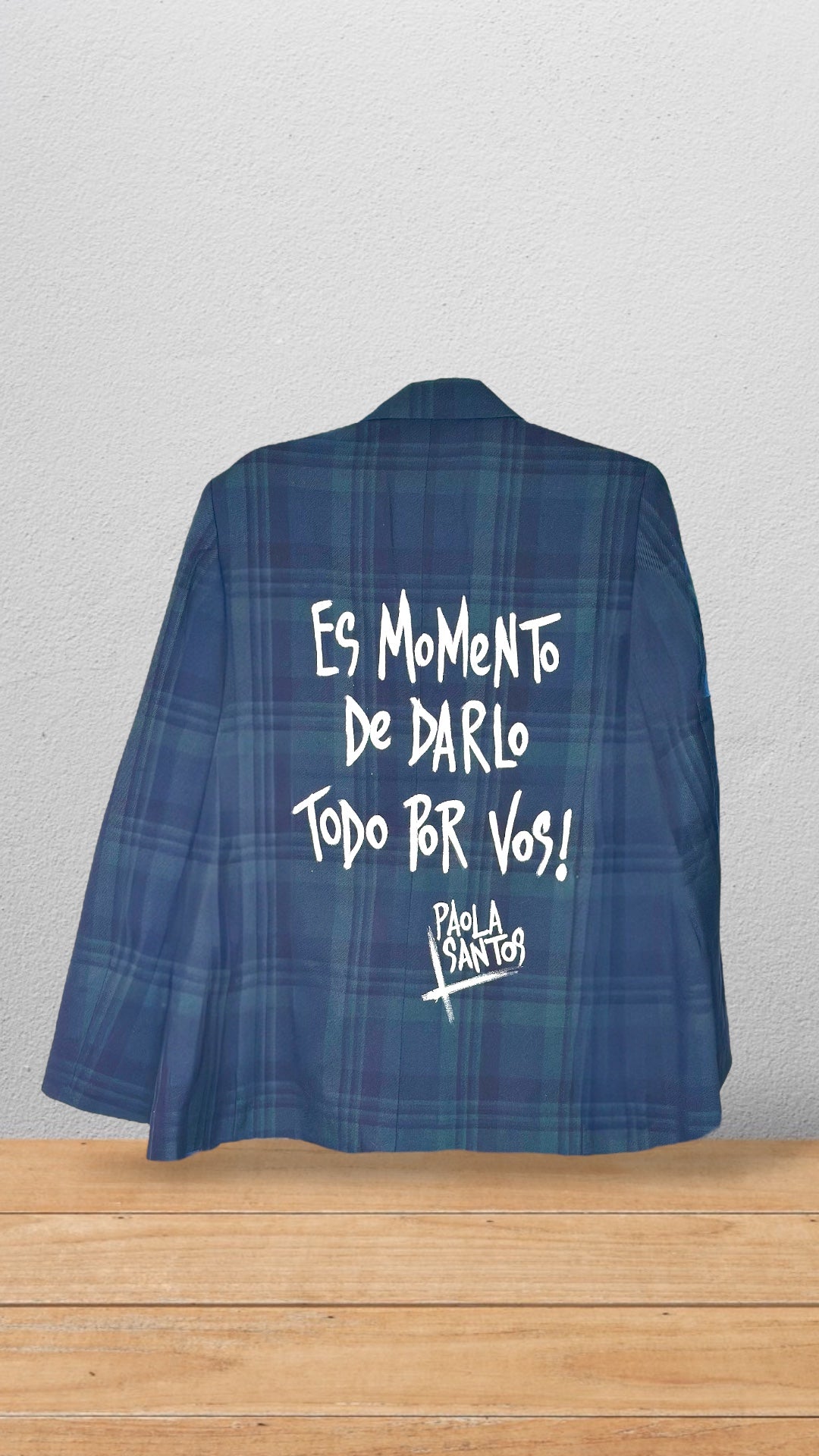 Blazer de estampa escocesa con un corte estructurado, moderno y unisex. Intervenido a mano con pintura artĂstica que combina rebeldĂa y sofisticaciĂłn: labios icĂłnicos en el frente y una frase potente en la espalda que dice “Es momento de darlo todo por vos”.