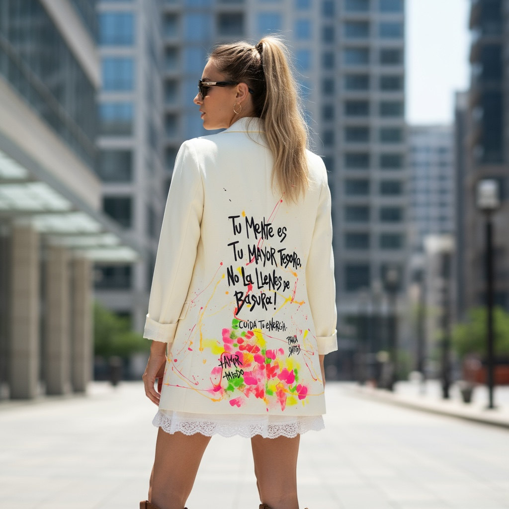 Blazer oversize pintado a mano, con la frase “Tu mente es tu mayor tesoro, no la llenes de basura”.
