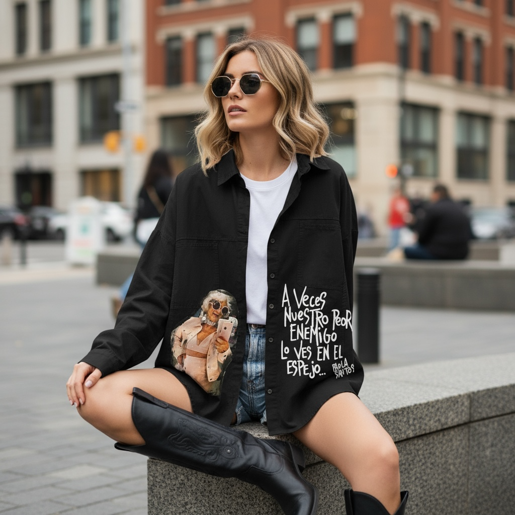 Camisa oversize negra de denim liviano con ilustración pintada a mano de una mujer selfie.