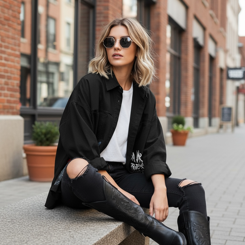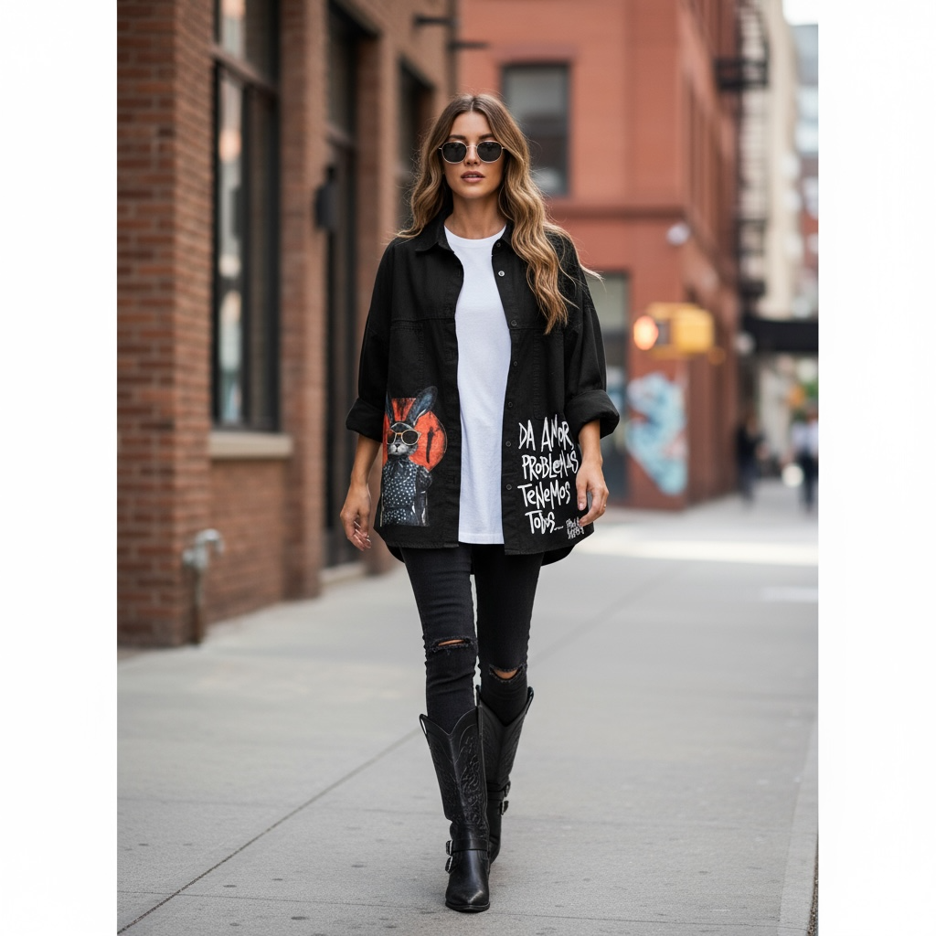 Camisa oversize negra de denim liviano, intervenida a mano con arte exclusivo de Paola Santos.