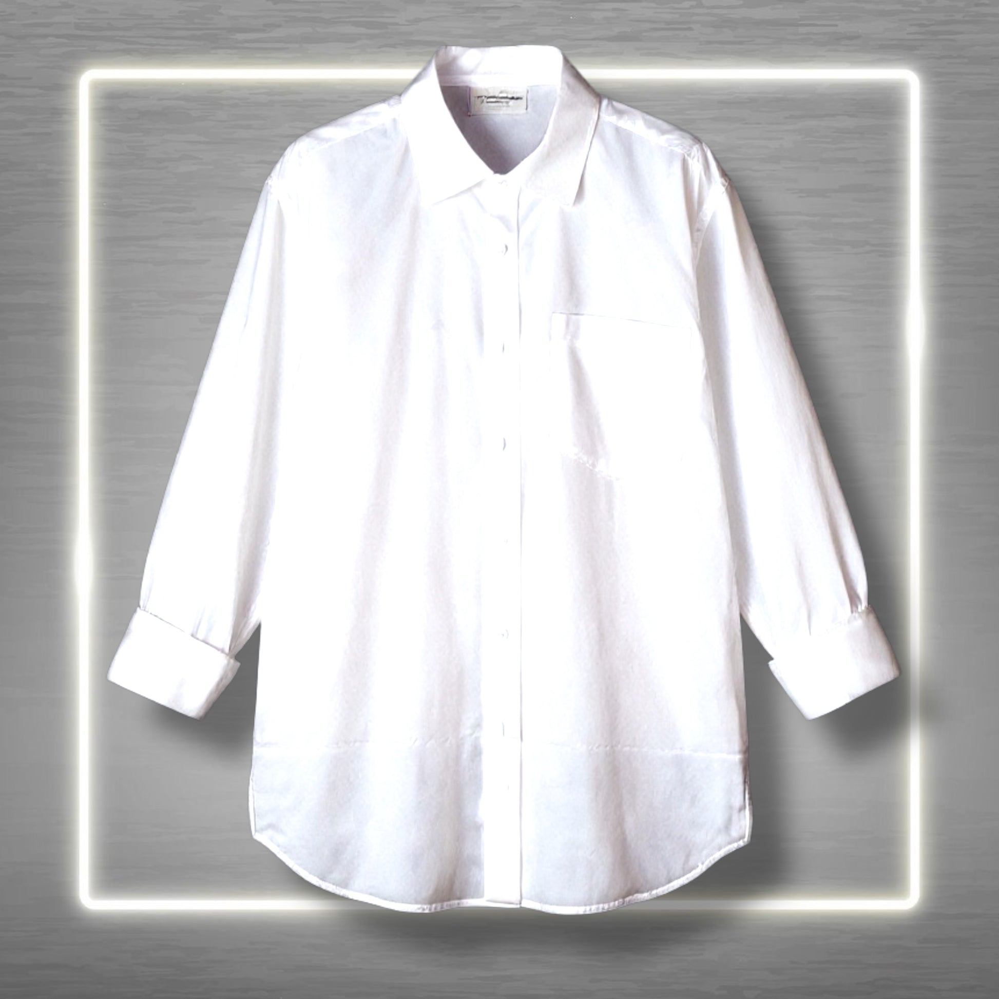 Camisa blanca de popelina intervenida a mano. En la espalda, una obra con flores sobre fondo gris y la frase “Es momento de darlo todo por vos… Cuidá tu energĂa. No negocies tu paz.”.