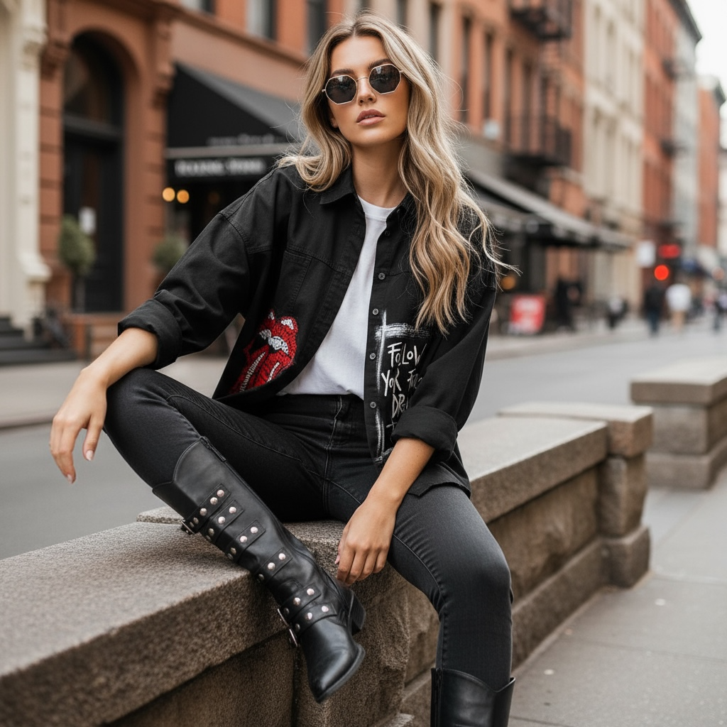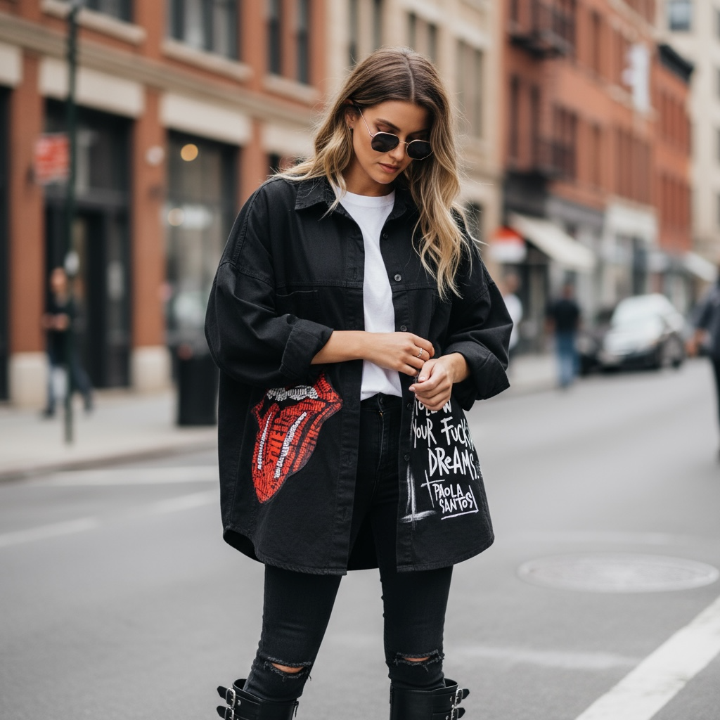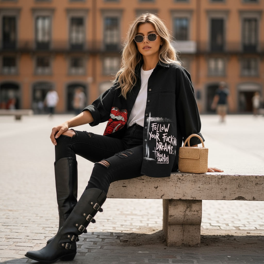 Camisa oversize negra de denim fino, con pintura textil inspirada en el ícono de los Rolling Stones y la frase que resume el espíritu Paola Santos: