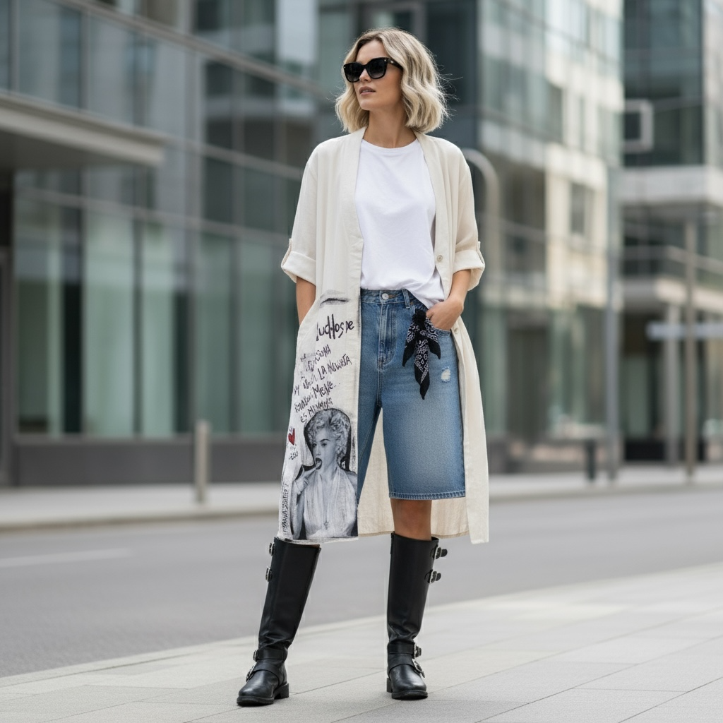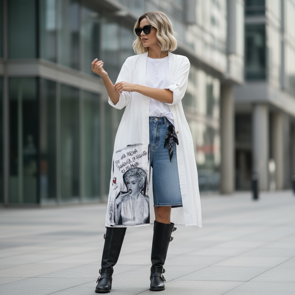 Su corte amplio y fluido permite usarla abierta como abrigo liviano o cerrada como vestido. Una pieza para mujeres que eligen expresarse con estilo y actitud.