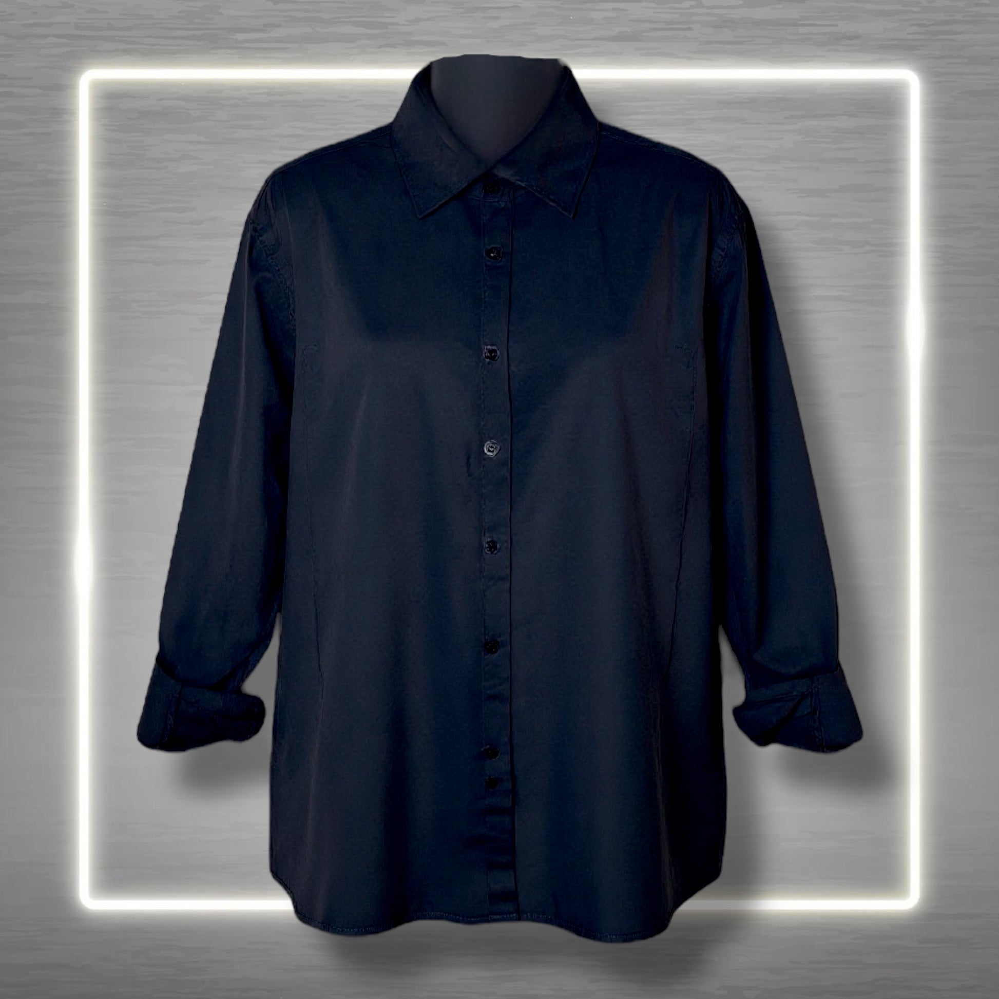 Camisa negra de popelina con arte abstracto en tonos fucsia.