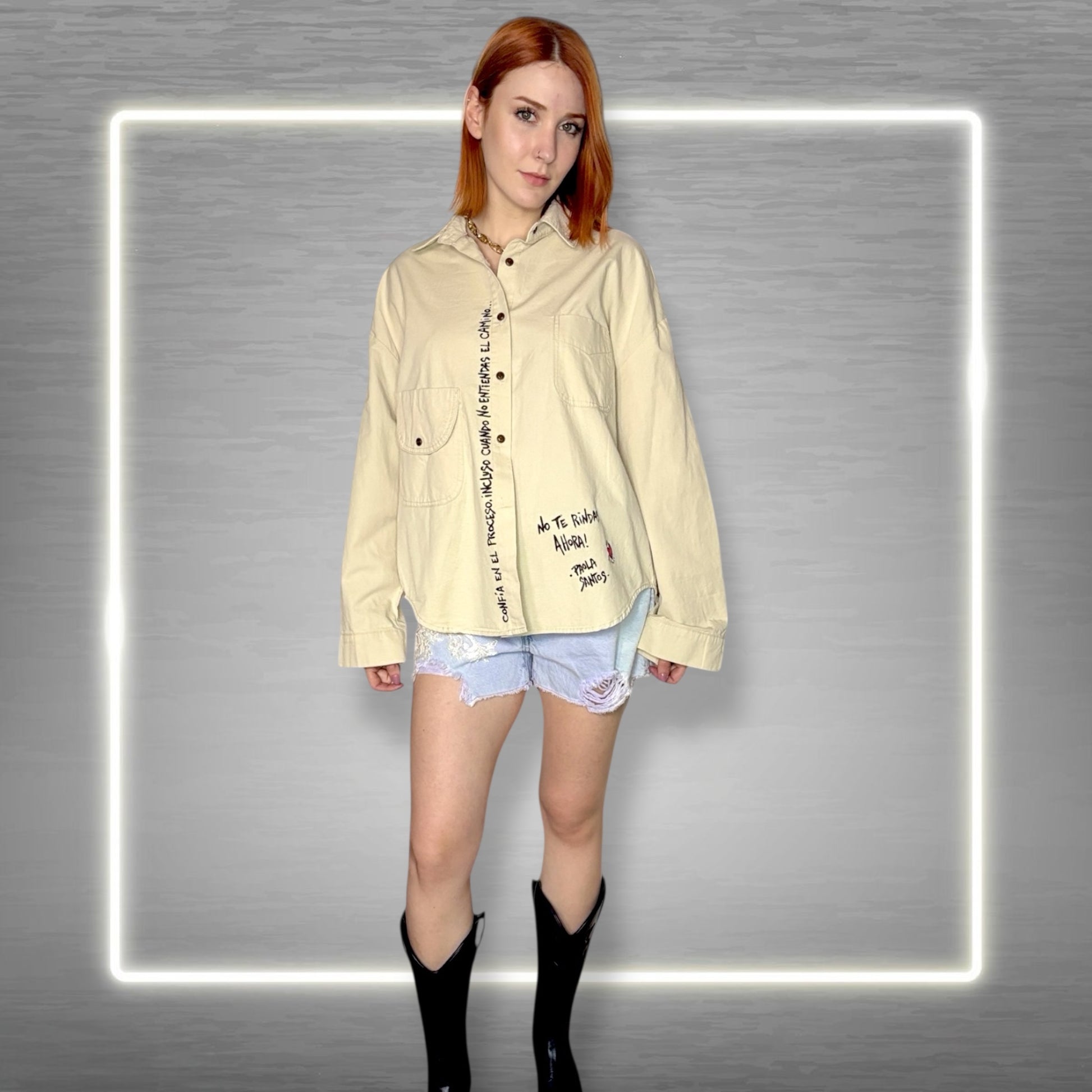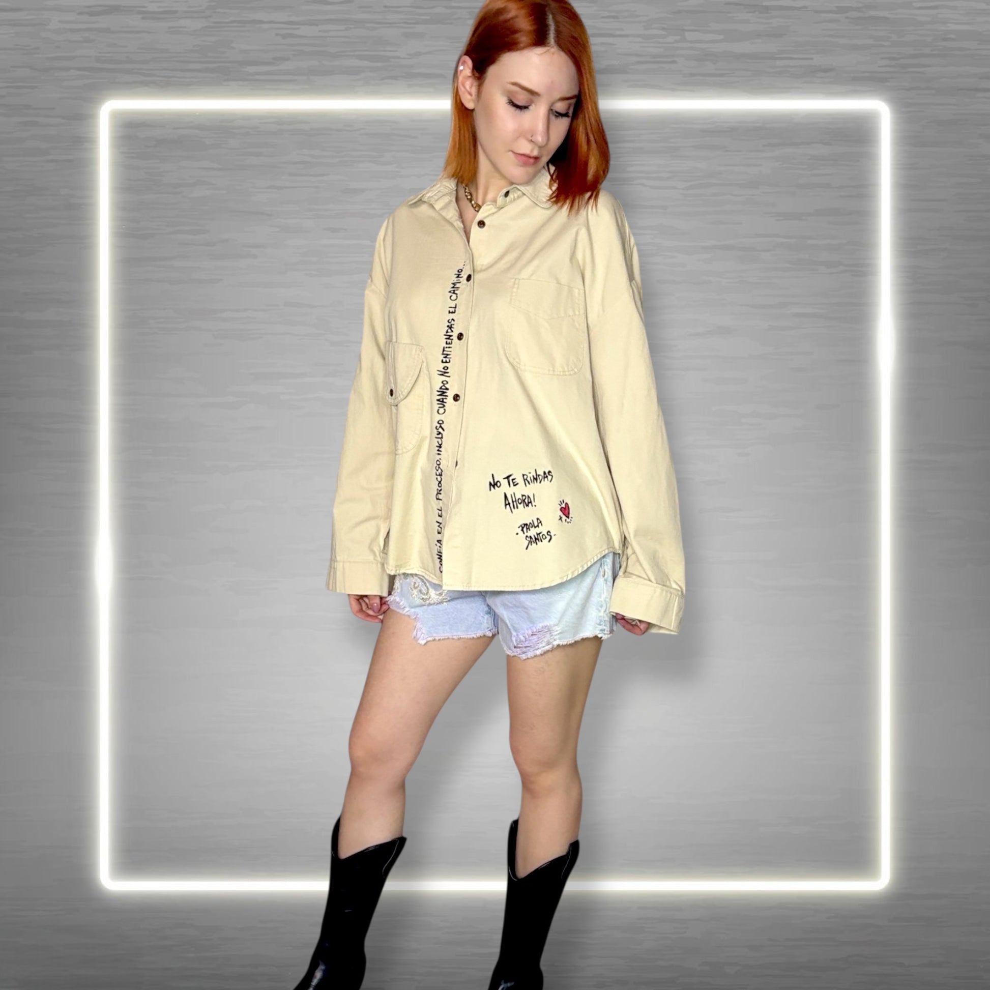 Camisa oversize beige pintada a mano con la frase “No te rindas ahora”, un recordatorio de fuerza, constancia y esperanza.