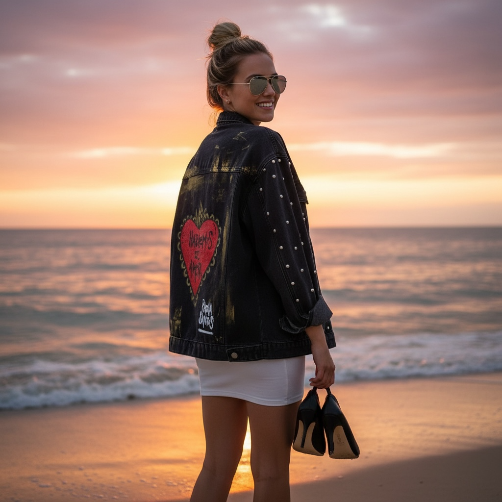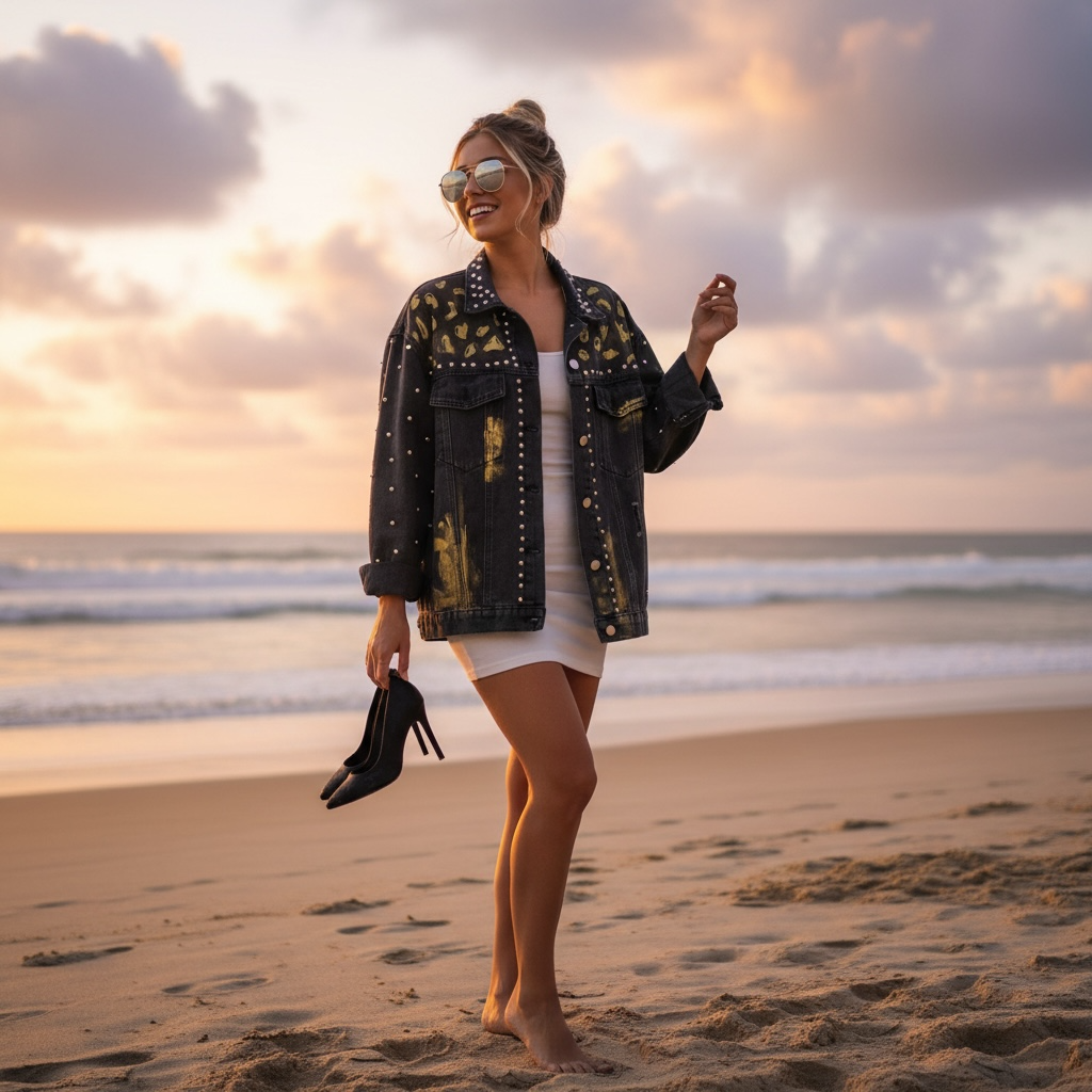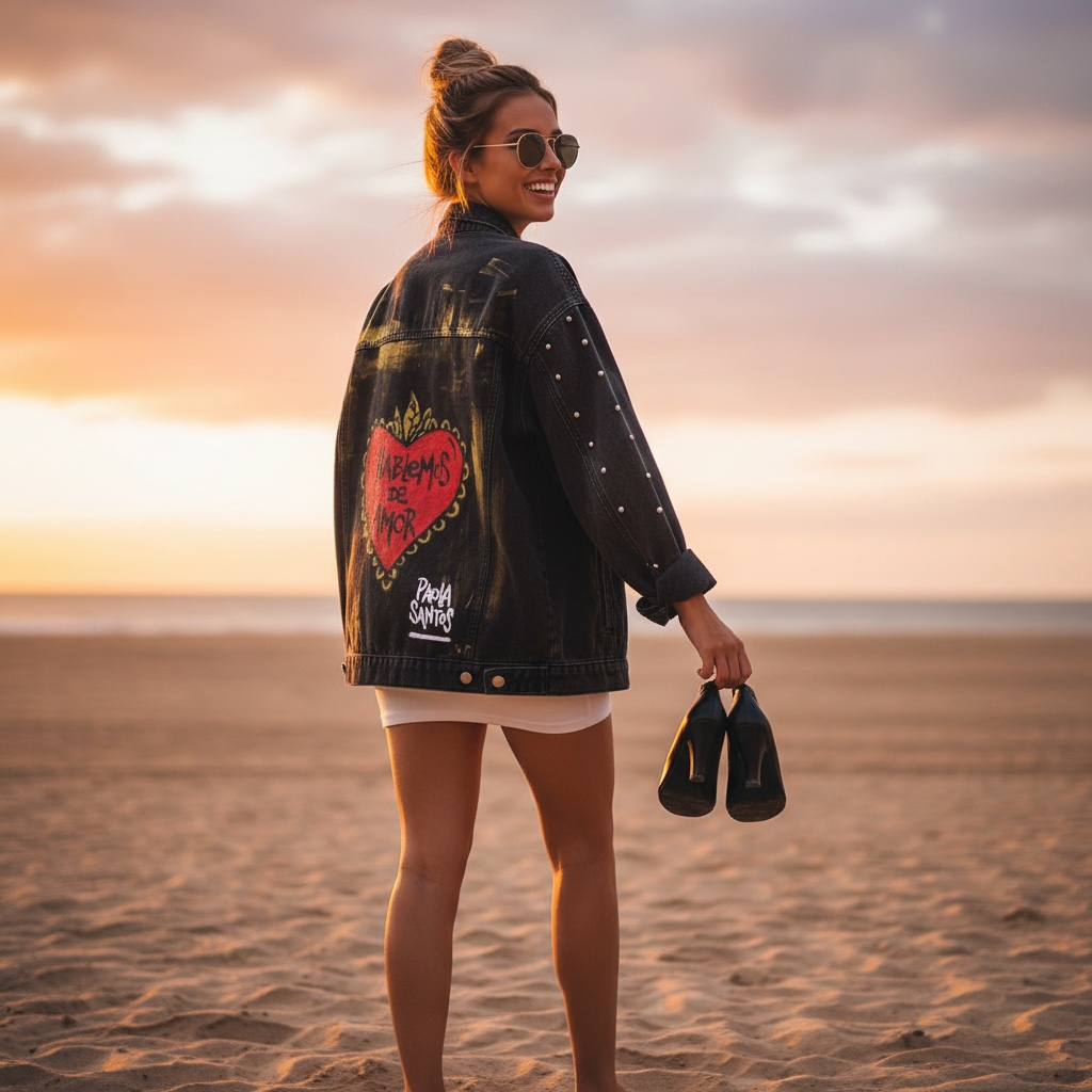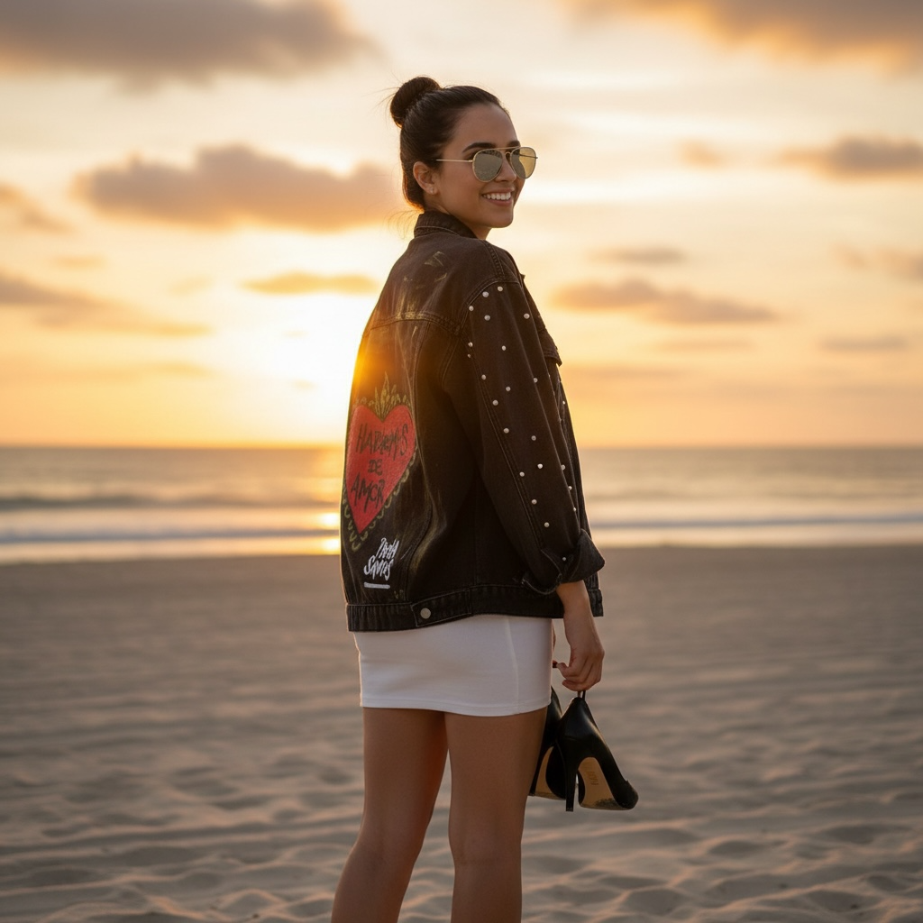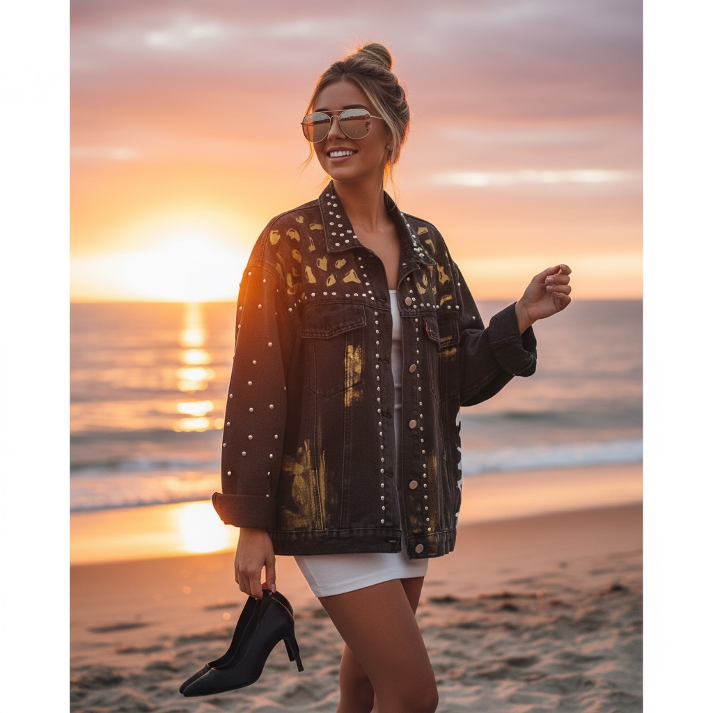 • Apliques: Tachas metálicas distribuidas en frente y mangas