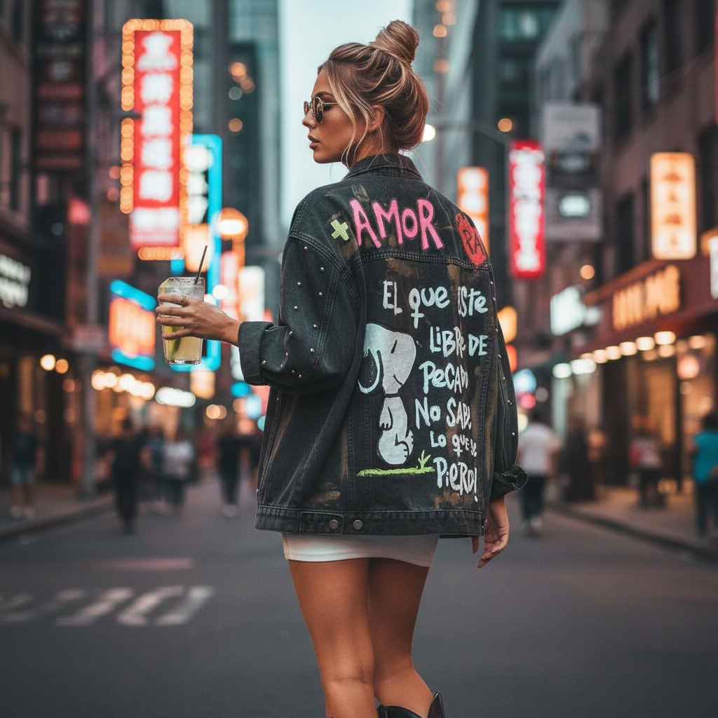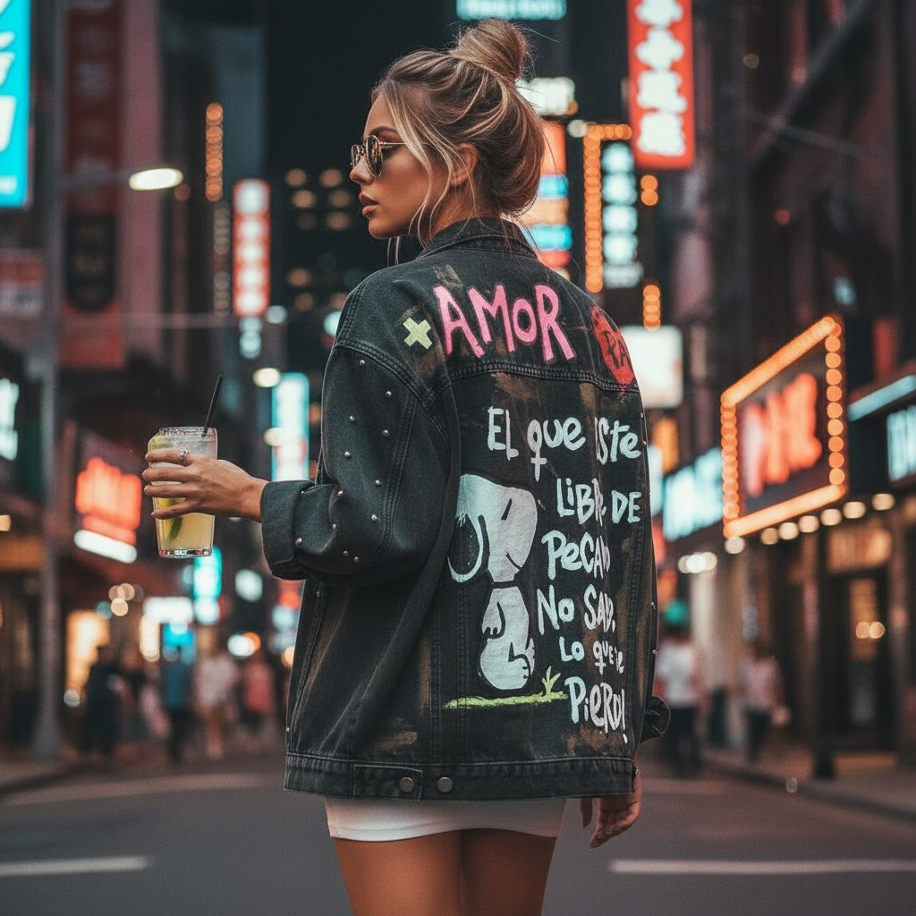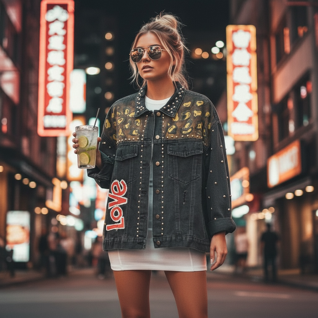 • Apliques: Tachas metálicas distribuidas en frente y mangas