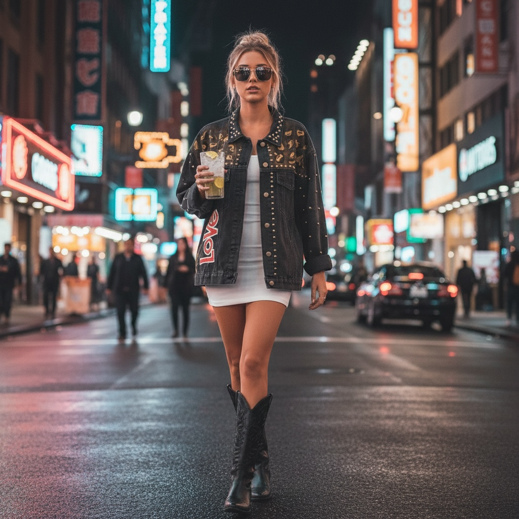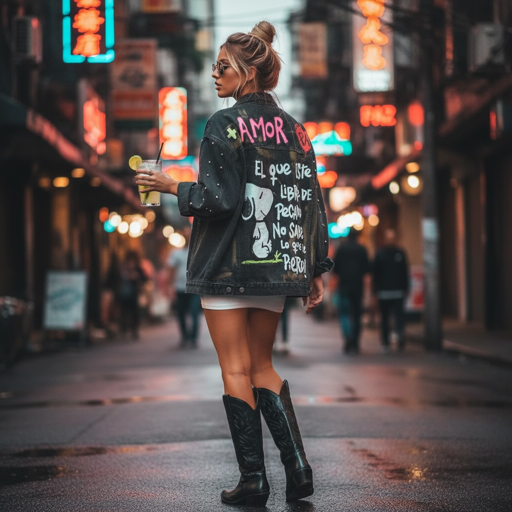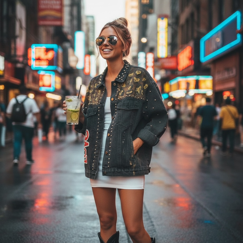 • Apliques: Tachas metálicas distribuidas en frente y mangas