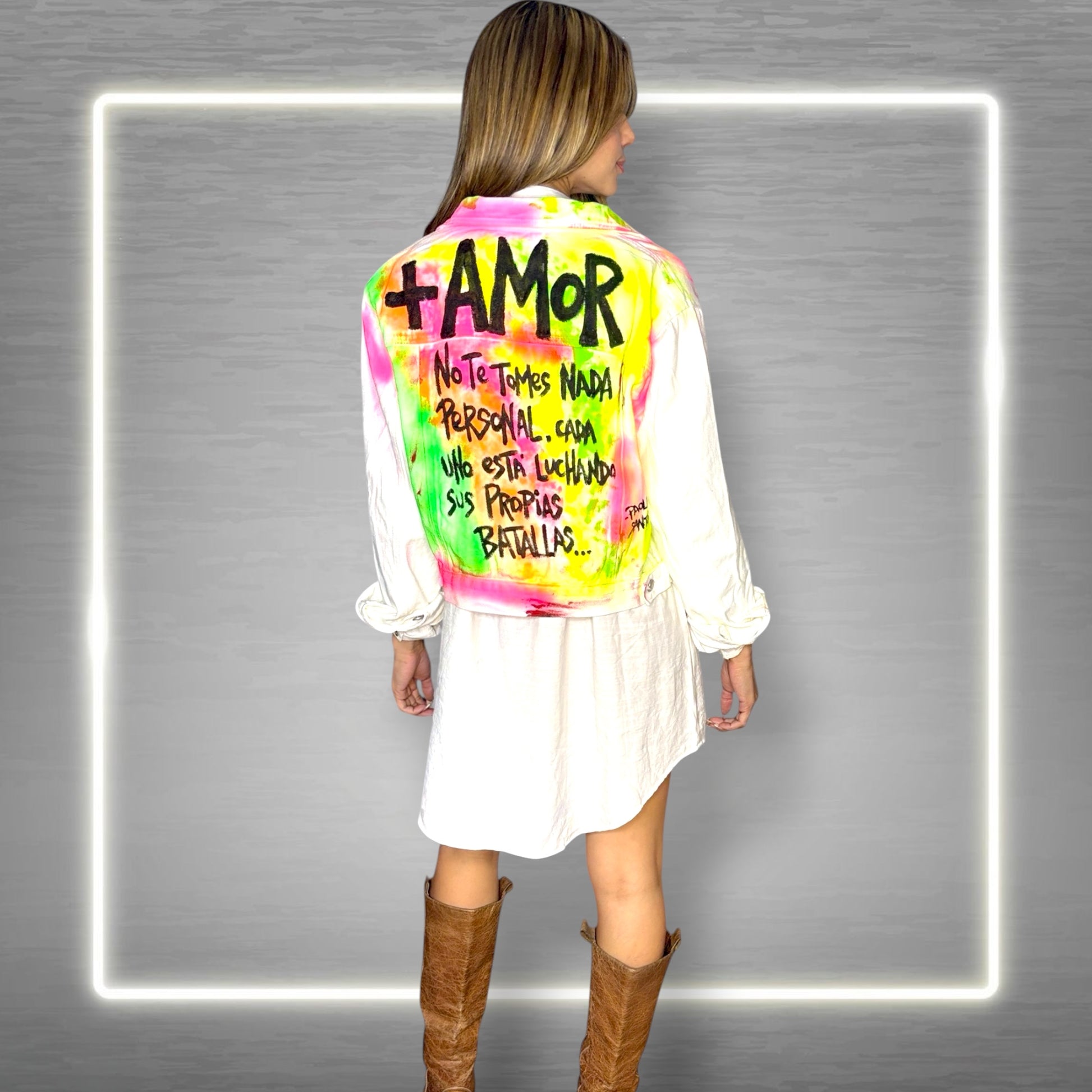 Campera de jean intervenida a mano con la frase “+AMOR / No te tomes nada personal, cada uno está luchando sus propias batallas”.