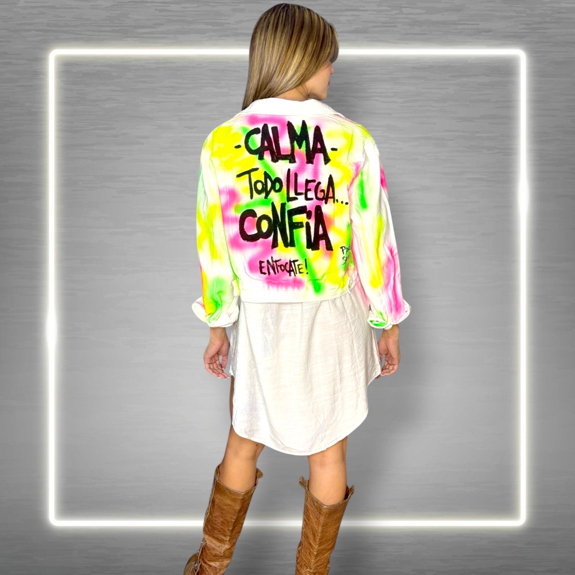 Campera de jean intervenida a mano con la frase “CALMA. Todo llega… confiá. Enfocate.”