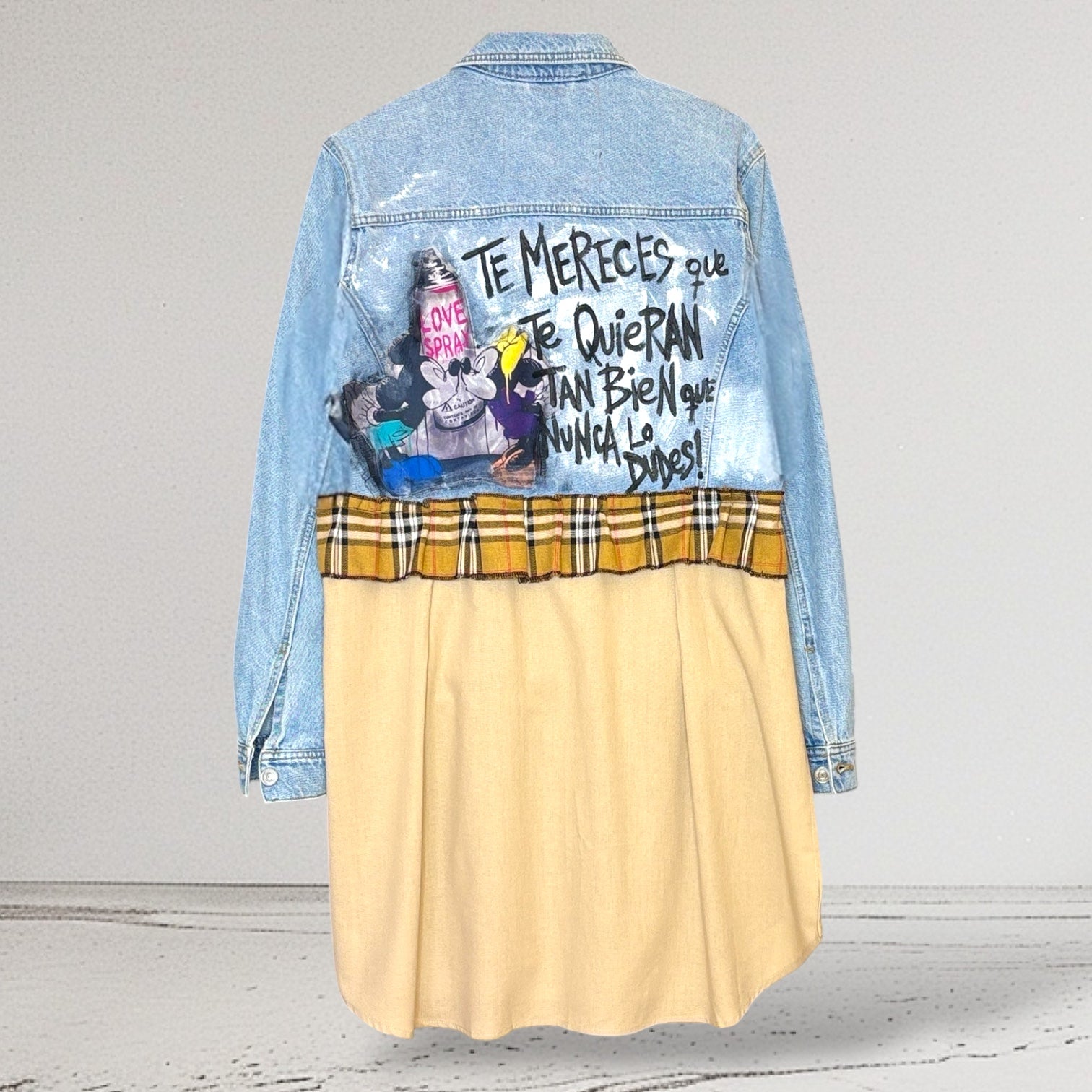 Una campera única de denim claro, intervenida a mano con arte urbano que combina ilustración y mensaje positivo. La frase “Te merecés que te quieran tan bien que nunca lo dudes” es un recordatorio de amor propio y de rodearse de vínculos sanos.