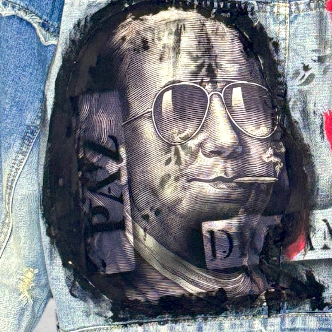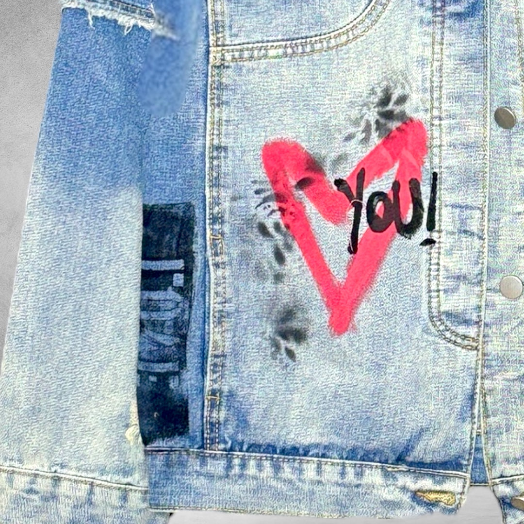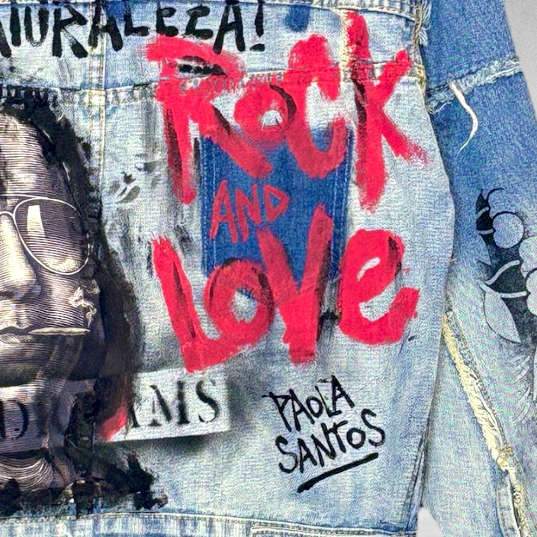 Campera de jean oversize, 100% algodón, intervenida a mano con arte urbano y un mensaje que rompe con lo establecido.
