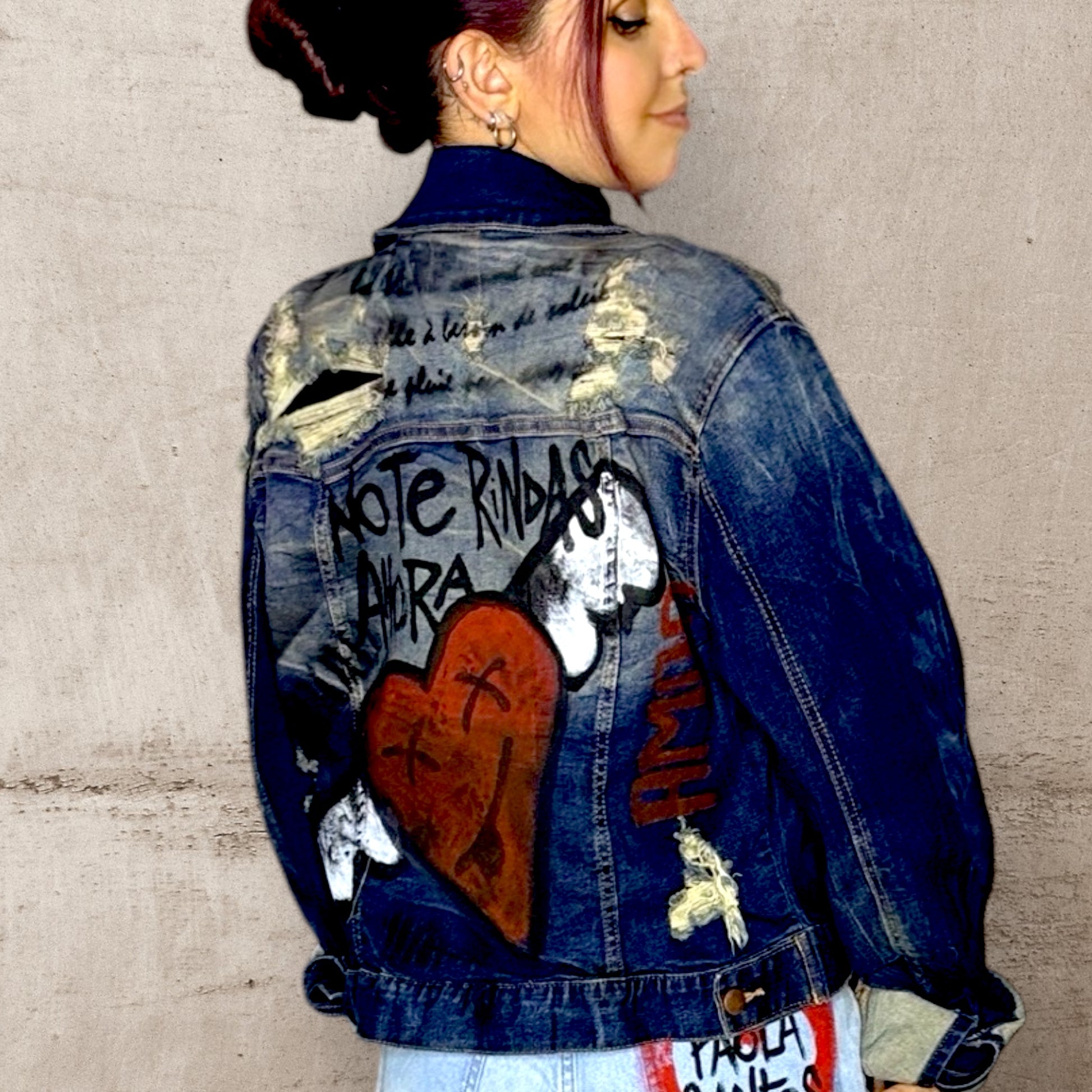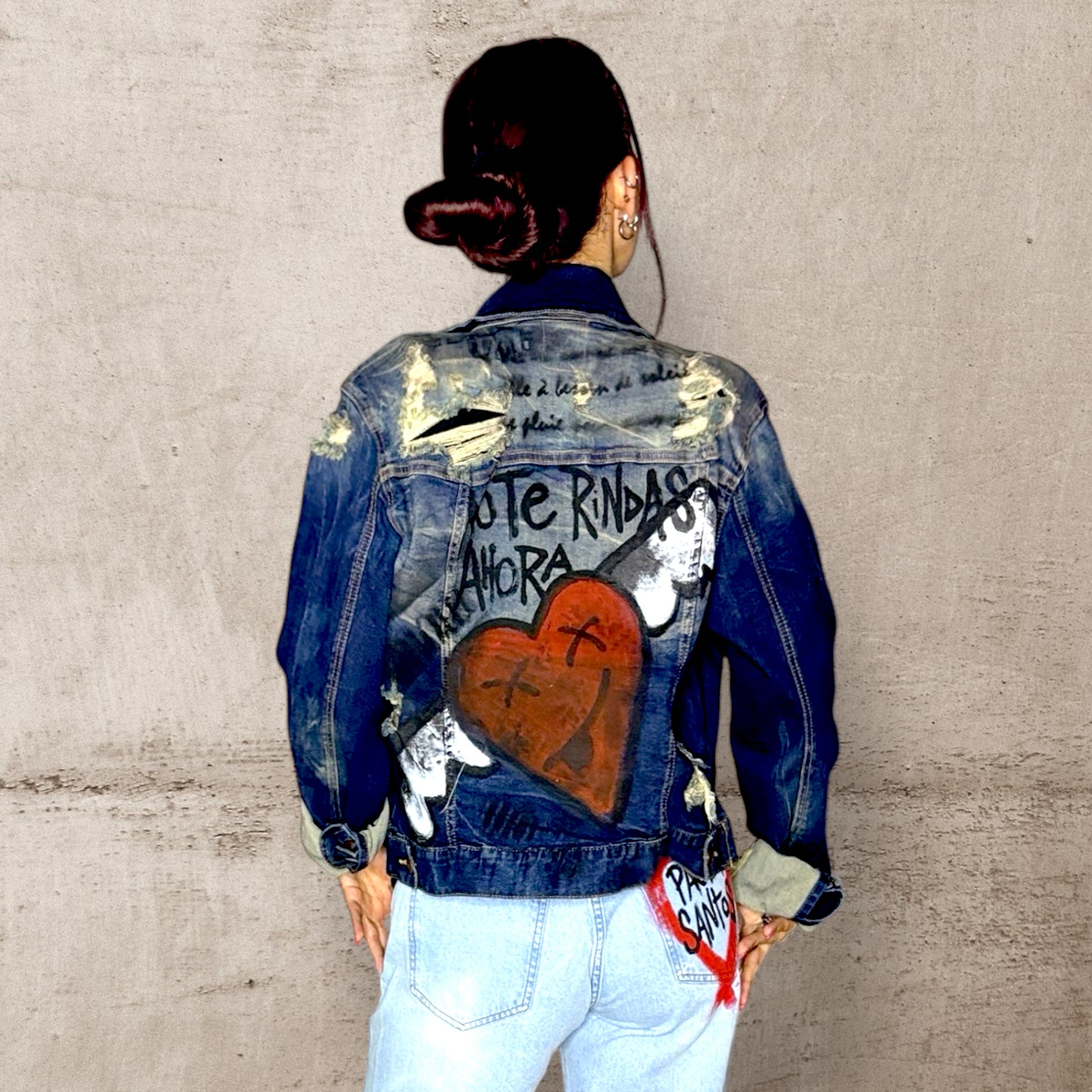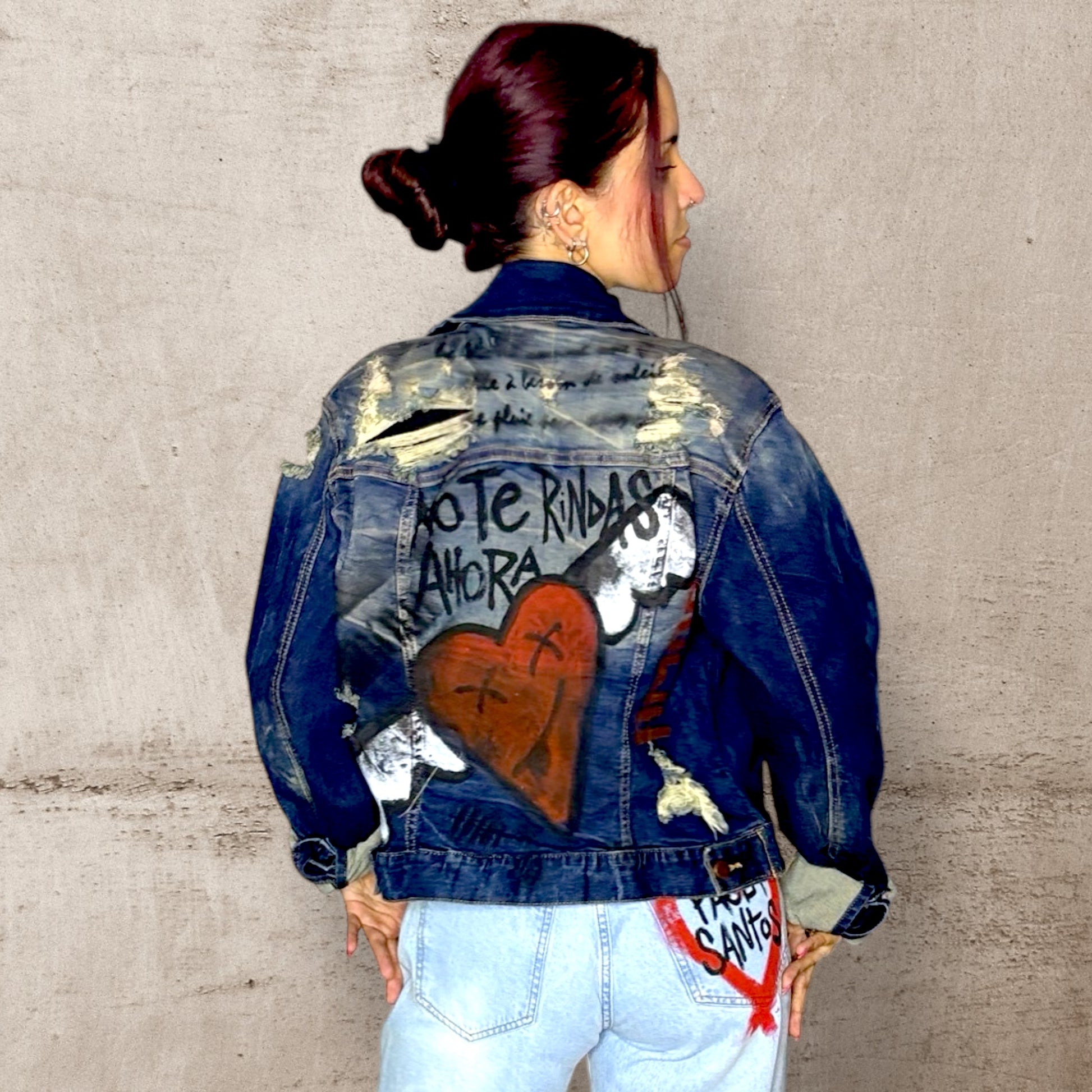 Campera de jean oversize, pintada a mano con un diseño artístico que transmite fuerza y amor. El corazón alado en la espalda y la frase “No te rindas ahora” convierten esta prenda en un manifiesto de resiliencia y autenticidad. Única y cargada de energía emocional, es ideal para quienes buscan vestir con estilo propio y mensajes poderosos.