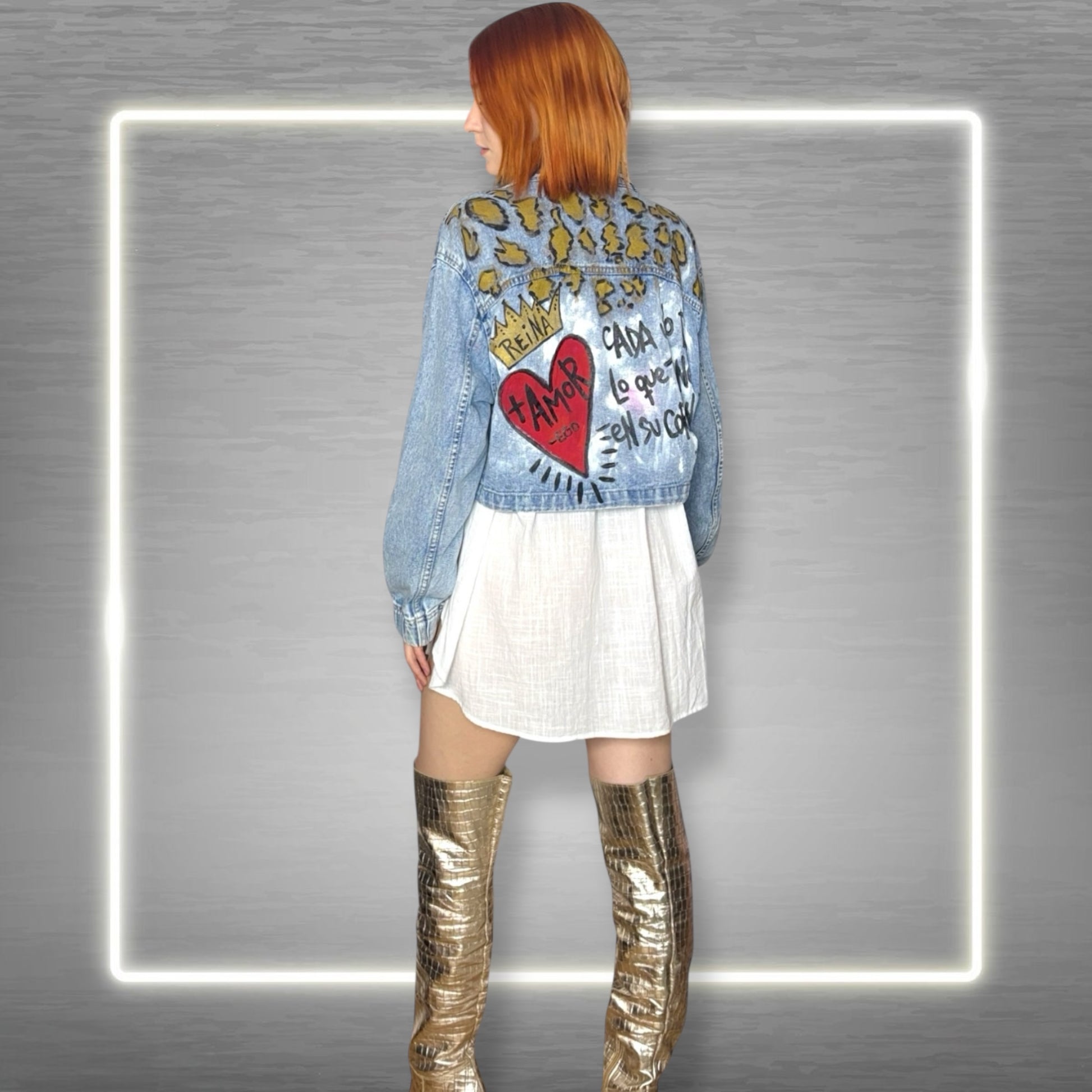 Campera de jean intervenida a mano con estampado animal print dorado sobre los hombros y diseño artístico en la espalda con la frase “Ama mucho. El tiempo vuela” y un corazón con corona que simboliza poder, amor y autenticidad. Una prenda única, creada para mujeres que reinan desde la sensibilidad y la fuerza.