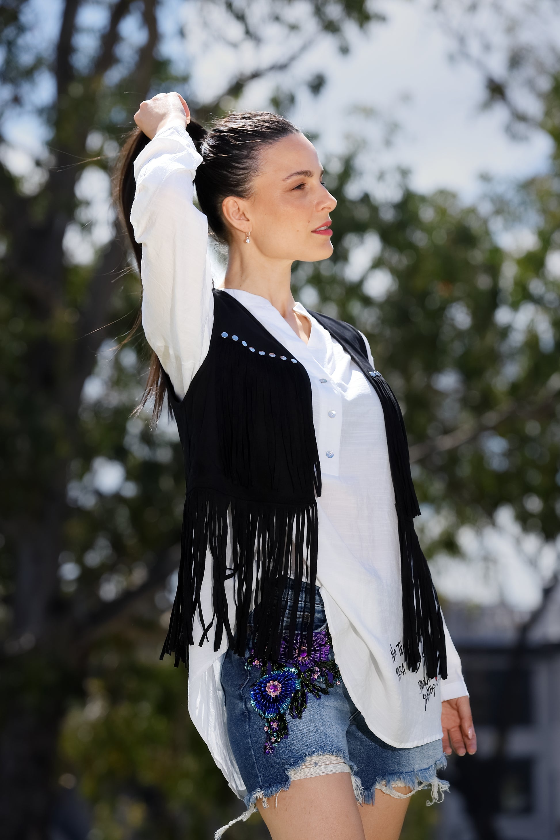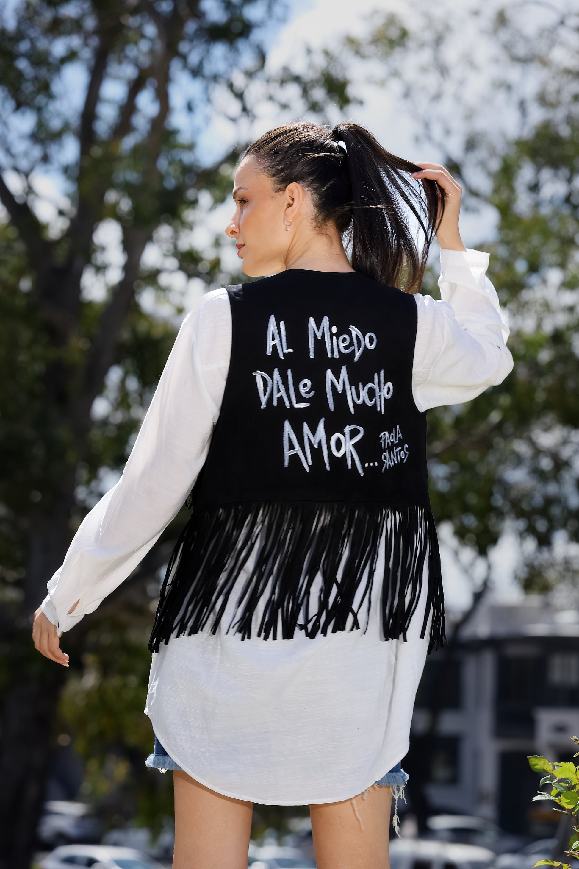 Chaleco negro con flecos largos y aplicación de tachas plateadas, liviano, con textura suave y delicada al tacto. Su espalda lleva una intervención artística pintada a mano con la frase “Al miedo dale mucho amor”, un recordatorio de fuerza y sensibilidad en una misma prenda.