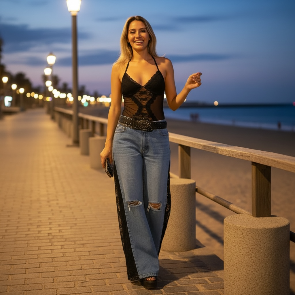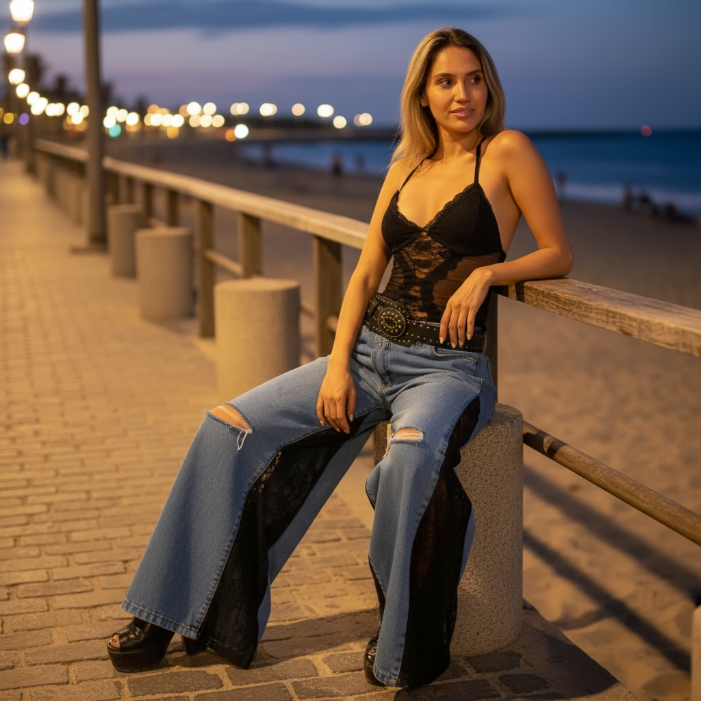 El diseño incorpora paneles laterales en encaje negro translúcido que generan movimiento, contraste y una estética muy particular. La cintura cruzada estiliza visualmente y convierte a esta prenda en una pieza protagonista, ideal para looks de noche o outfits de alto impacto.
