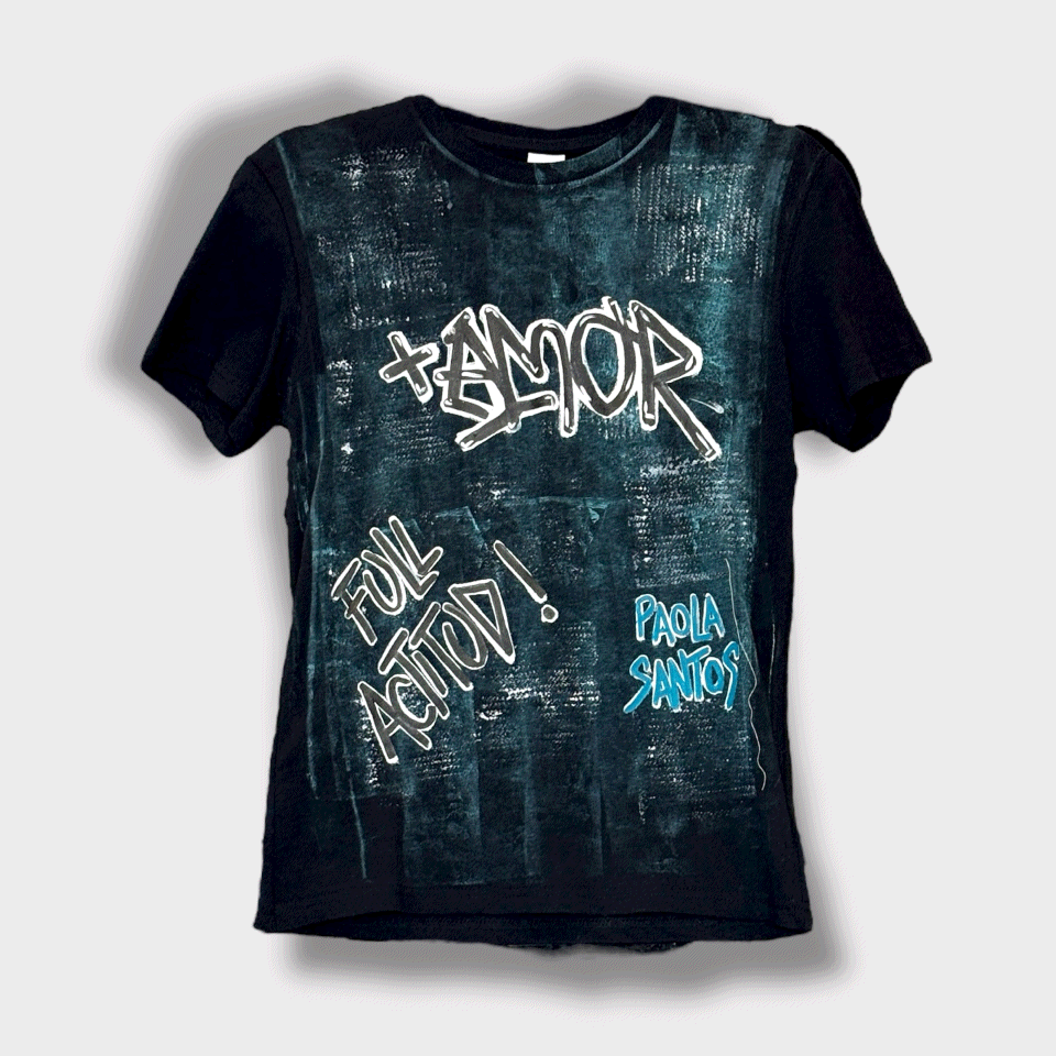 Remera urbana de la lĂnea Kids by Paola Santos, pintada a mano con frases llenas de energĂa positiva: “+ Amor” y “Full Actitud”.